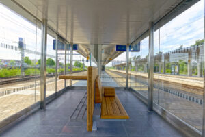 Ein beheizter Glaspavillon am Bahnsteig, Urban-Gardening und Sitzgelegenheiten auf dem Vorplatz, kostenloses WLAN und eine Mooswand, die für eine natürliche Atmosphäre sorgt – so angenehm kann ein Bahnhofsaufenthalt sein.